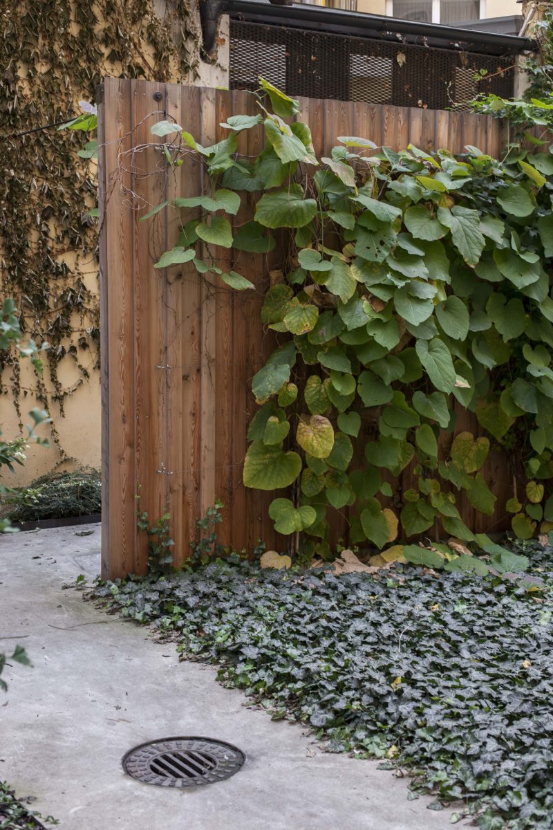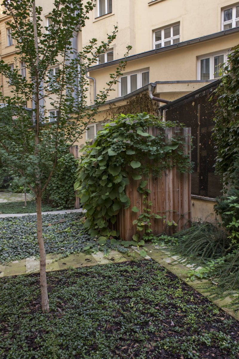 A yard in the midst of Art Noveau buildings in the New Town, Prague, transformed into a green oasis to play and relax in. The entertainment area – complete with lightning, greenery, bike racks, and a children’s play corner – is separated by the utilitarian space with waste sorting bins by a light wooden construction.