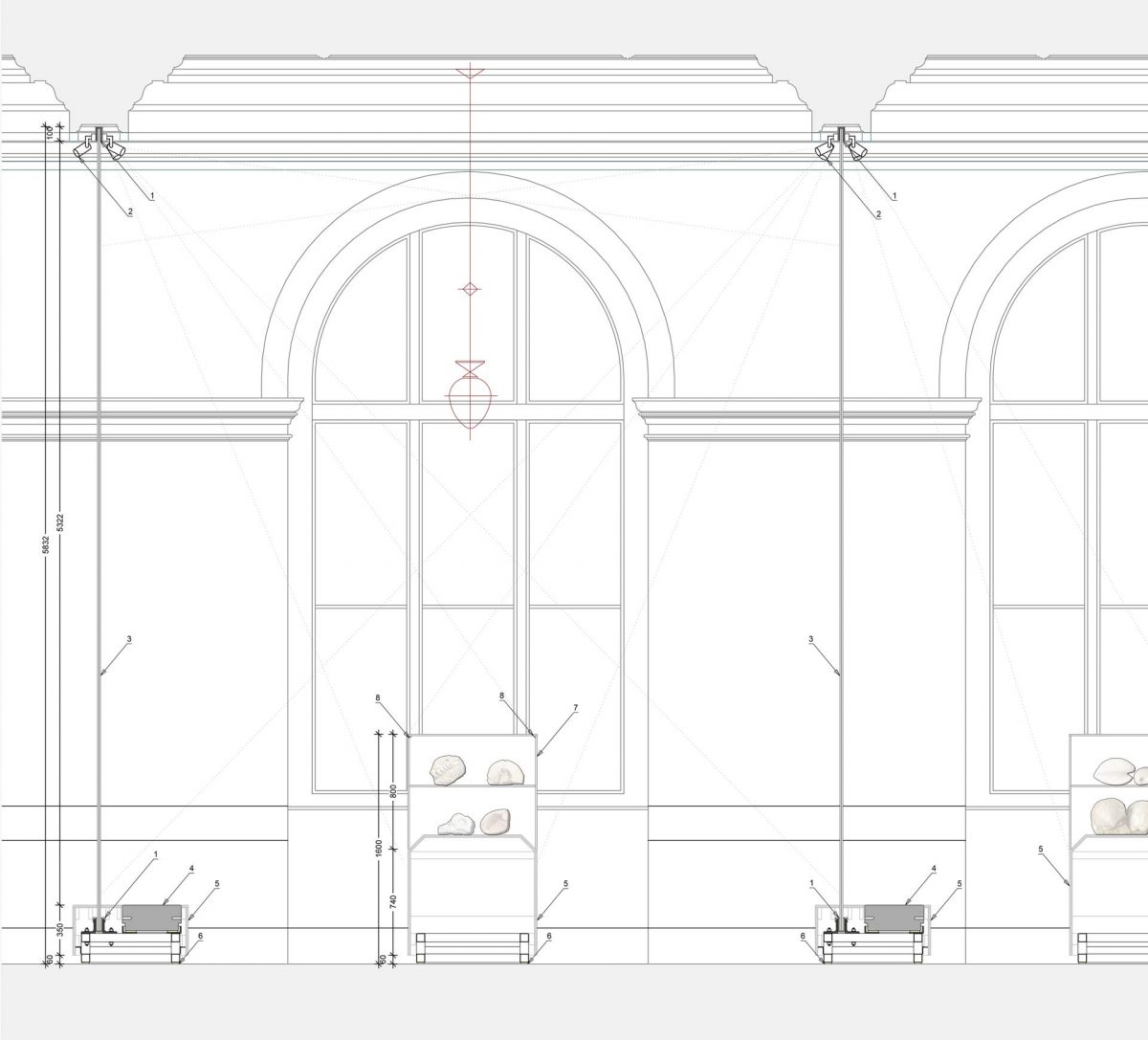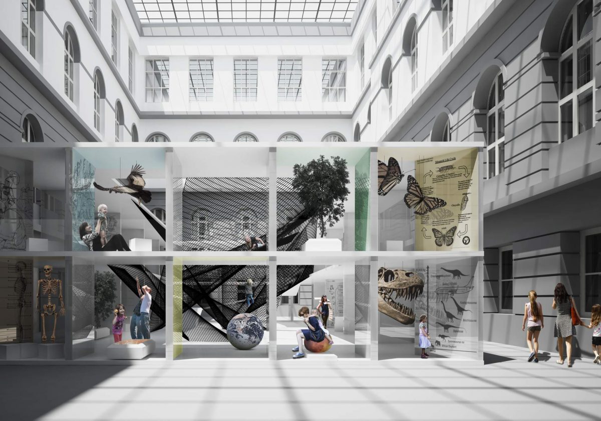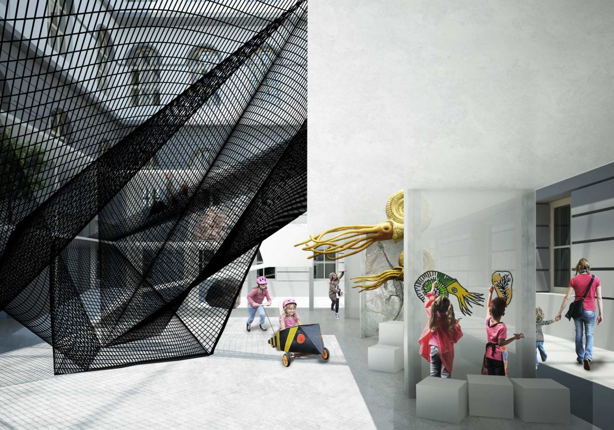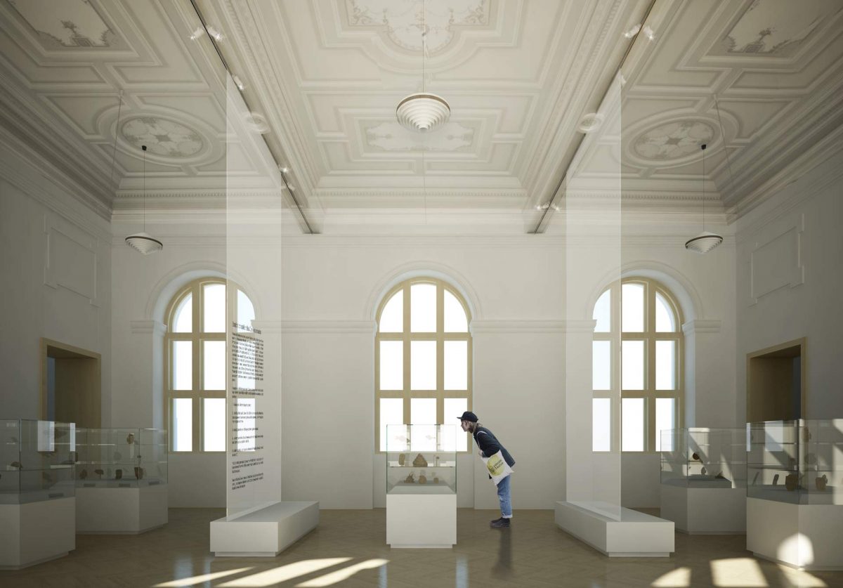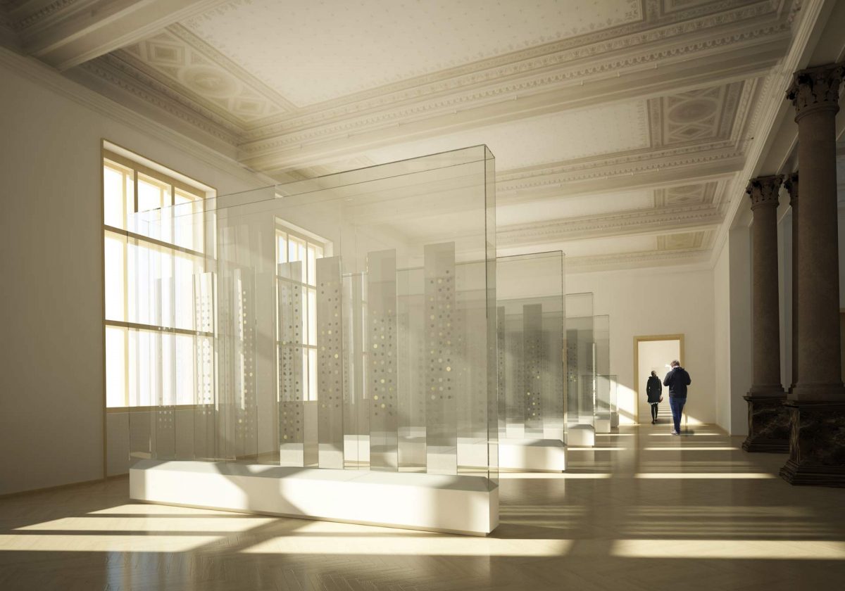 Respecting the original interior of the Museum’s main building, we hung the transparent panels on its existing ceiling beams. In the new building, we followed the repetitive rhythm of the original pillars. To emphasize the exchange between old and new, we added a corridor to connect the two buildings.