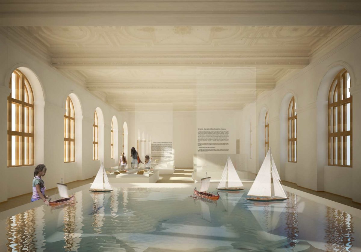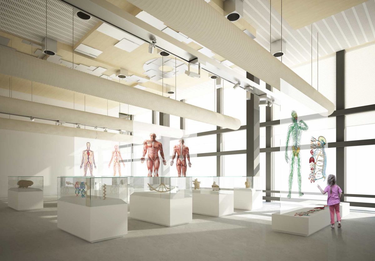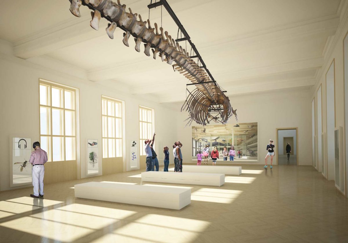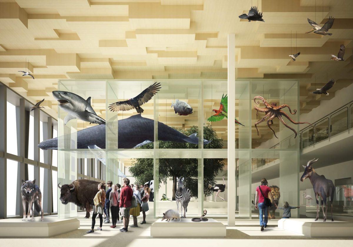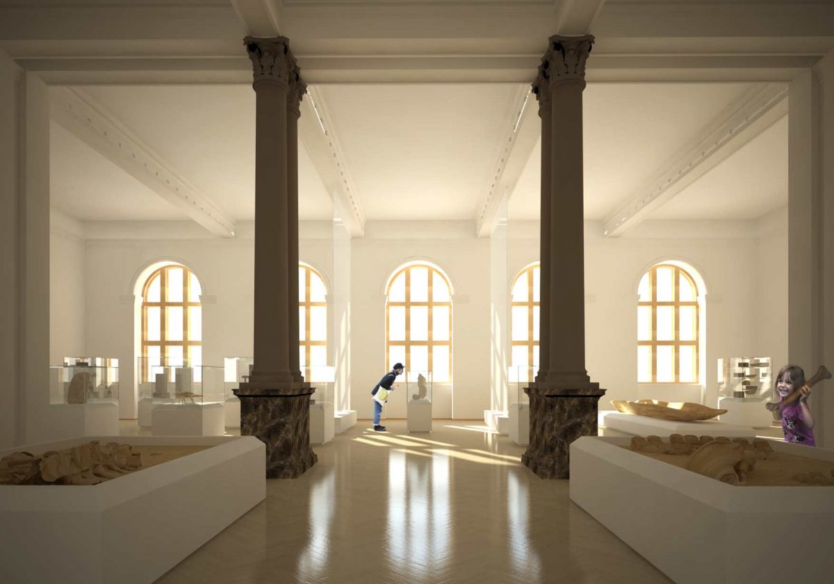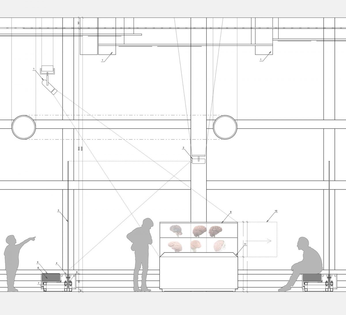 Respecting the original interior of the Museum’s main building, we hung the transparent panels on its existing ceiling beams. In the new building, we followed the repetitive rhythm of the original pillars. To emphasize the exchange between old and new, we added a corridor to connect the two buildings.