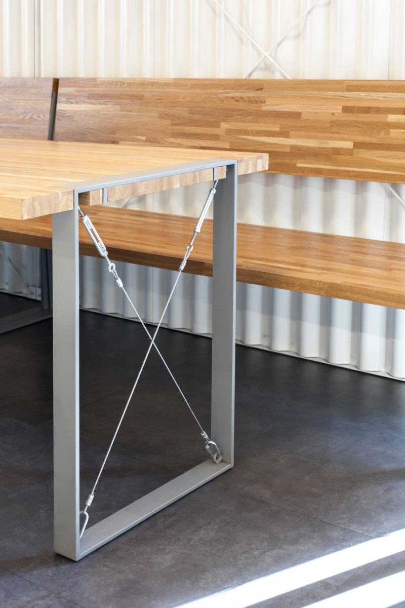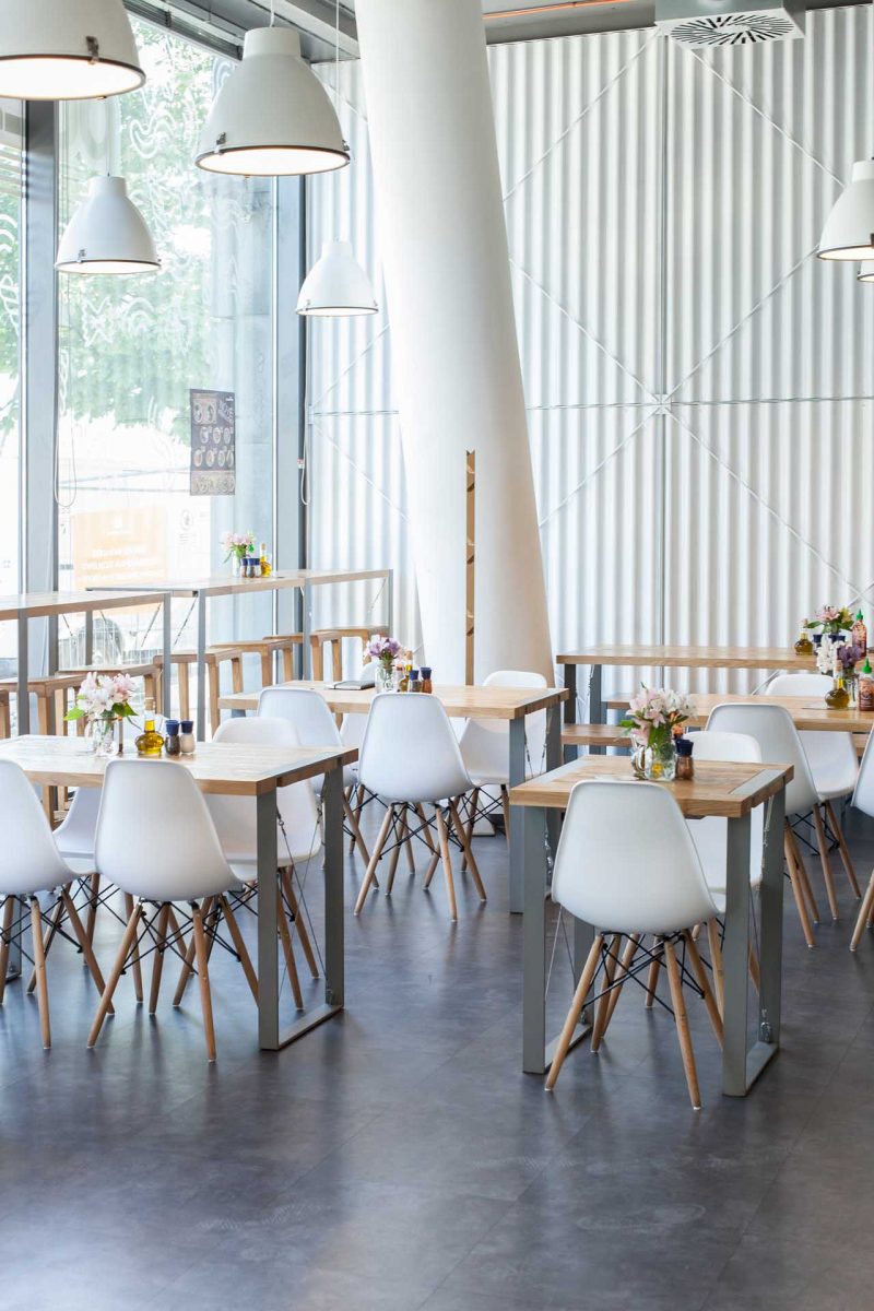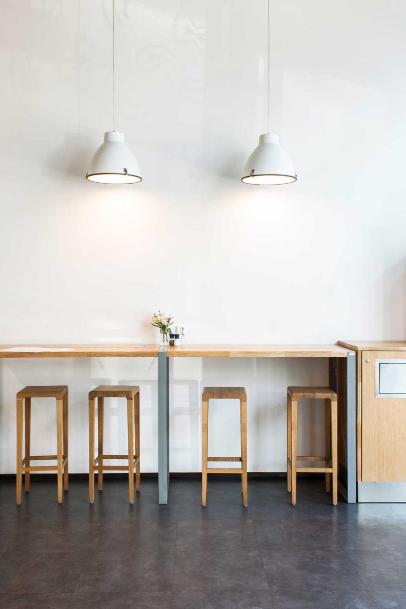 We used wood as a connection element in all Puzzle salads restaurants. Here we combined it with a set of sleek tiles, and styled the whole interior in shades of grey and white.