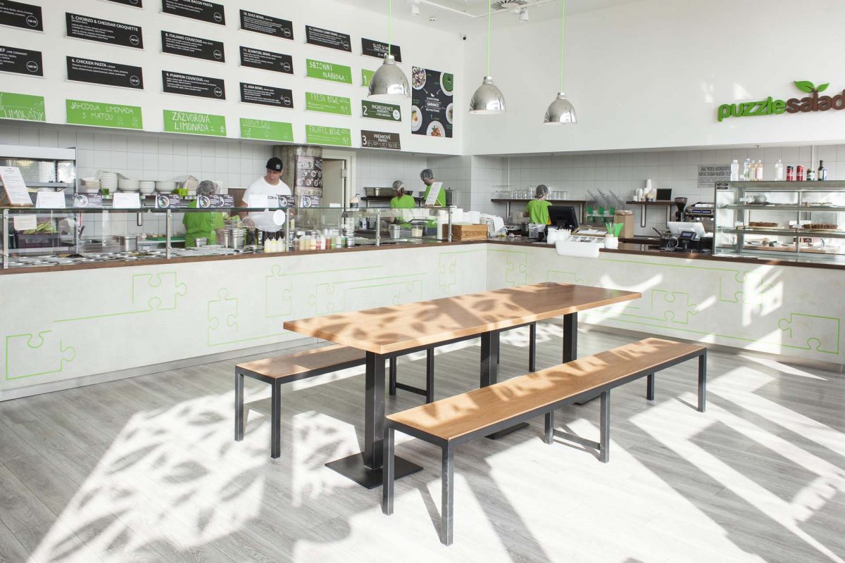 Concrete, metal, and wood: the three distinct materials are brought together by light-green elements which permeate the whole restaurant space.